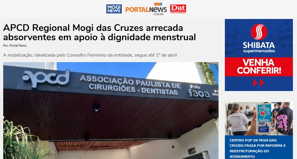 APCD Regional Mogi das Cruzes arrecada absorventes em apoio à dignidade menstrual Portal News/Mogi News – 04/03/2026 Leia mais » 8 de abril de 2026